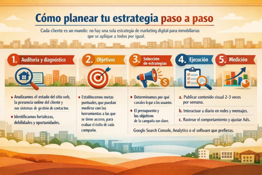 Cada cliente es un mundo: no hay una sola estrategia de marketing digital para inmobiliarias que se aplique a todos por igual. Y, sin embargo, a menudo esas estrategias únicas se desarrollan utilizando una serie de pasos comunes a todas ellas: