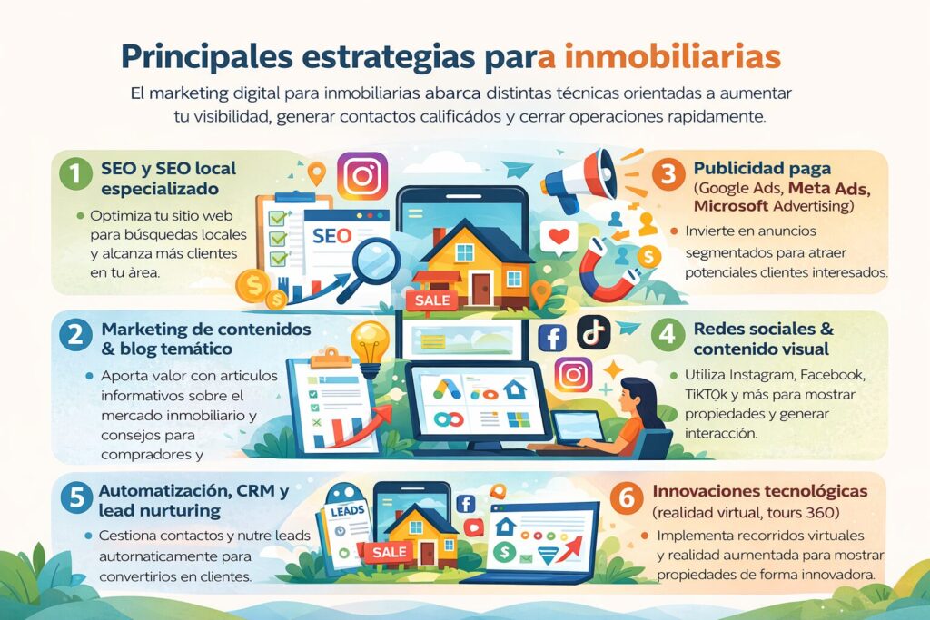 El marketing digital para inmobiliarias abarca distintas técnicas orientadas a aumentar tu visibilidad, generar contactos calificados y cerrar operaciones rápidamente.