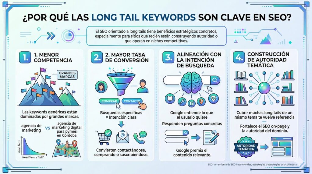 El SEO orientado a long tails tiene beneficios estratégicos concretos, especialmente para sitios que recién están construyendo autoridad o que operan en nichos competitivos.