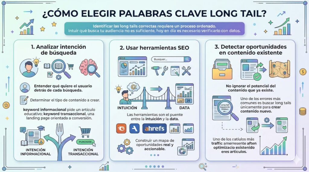 Saber a qué tipo de intención responde una long tail es esencial para determinar qué tipo de contenido crear. Una keyword informacional pide un artículo educativo; una transaccional, una landing page orientada a conversión.
