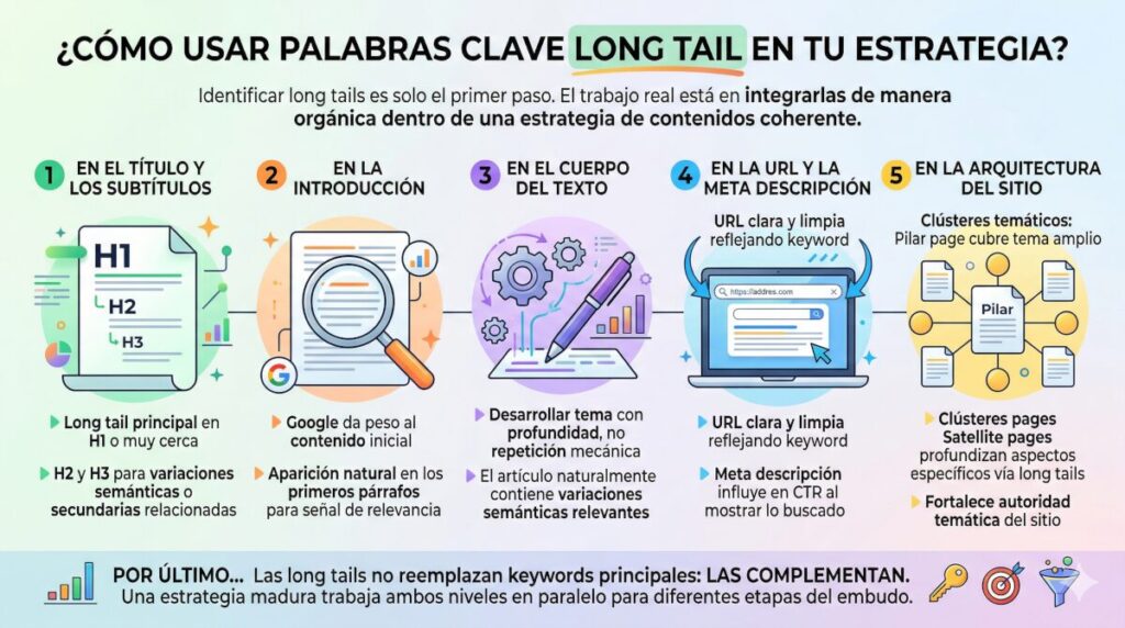 Identificar long tails es solo el primer paso. El trabajo real está en integrarlas de manera orgánica dentro de una estrategia de contenidos coherente.